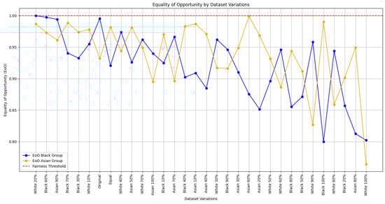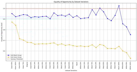 Conversely, the Equal Dataset Variation shows EoO values of 0.9316 for the Black group and 0.6440 for the Asian group, reflecting some inequity. The White 100% variation has the worst EoO values at 0.7537 for the Black group and 0.5317 for the Asian group, highlighting substantial inequity. Figure 10 shows Equality of Opportunity values for the Black and Asian groups across dataset compositions.