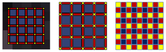 Each vertex (yellow) corresponds to one pixel: edge (blue); cube (red); and the cube complex itself. All the filter build information is encoded in a 9 × 9 array, with each element corresponding to a cell. Next consider the input data of dimension d and size , where is the number of vertices in each dimension. You can append information to a two-dimensional array with elements . This array consists of overlapping copies of arrays of size . Therefore, for two-dimensional image data, is the size of a square image. The main advantages of this data structure are the improved memory efficiency, the fact that the boundary relationship is implicitly encoded in the coordinates of cells, and that each cell can be accessed randomly and its boundary can be located quickly.