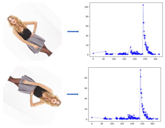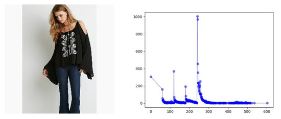 In this paper, color histogram, SURF features, and topology feature are used for clothing image retrieval. In the color histogram, after being divided into 16 intervals on the three components of R, G, and B, the colors are quantized, and finally 16 × 16 × 16 = 4096 color bins are formed. Then, count the number of these 4096 colors, that is, the color histogram. Due to the background of the image, the calculation effect after removing the histogram peak is shown in Figure 14. The similarity of two color histograms can be measured by Euclidean distance.