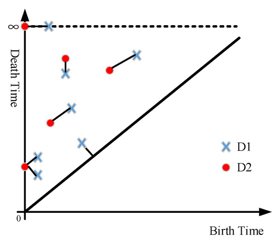 The bottleneck distance between two persistence graphs measures the cost between their corresponding relationship points. Simply put, two persistence graphs are transformed into the same scale coordinate system, and then every point in one persistence graph finds the nearest match in the other persistence graph, and calculates the distance between the two points. If the point is closer to the diagonal or y axis, no point matching is required. The matching effect is shown in Figure 9.