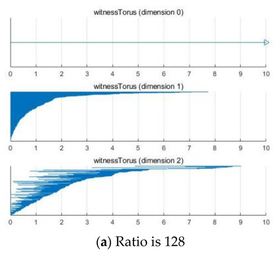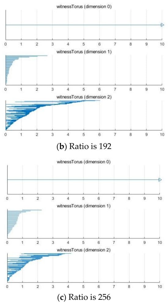 There is no requirement for the horizontal–vertical ratio of the image size in the calculation of the witness complex. Therefore, because both sides of the image in this dataset are invalid information, images are clipped and calculated. The specific clipping is to clip 40 pixels at the left and right ends, and the clipped image size is 176 × 256, which can reduce the calculation time of the witness complex without losing image information. Table 1 shows the running time in different sizes and ratios after cutting. Figure 11 shows the calculation results in the different sizes and ratios after cutting.