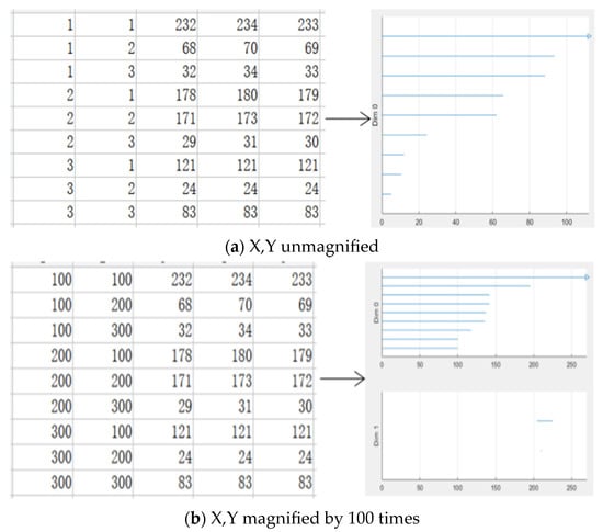 This zoom mode has little influence on the area with gentle pixel gray change, but has an obvious effect on extracting the topology features from areas with strong pixel gray changes. As shown in Figure 12, it can be clearly seen that the appropriate multiple of x and y coordinates can make certain topology features appear. Of course, different scales of scaling will extract the different scales of topology features. If the scaling factor is too small, the influence of the pixel coordinates on distance will be too small, which leads to the inability to extract most features. When the RGB influence on the distance is too small, this results in similar features for most pixel blocks, which cannot be effectively distinguished.