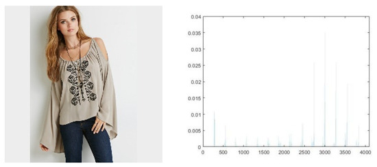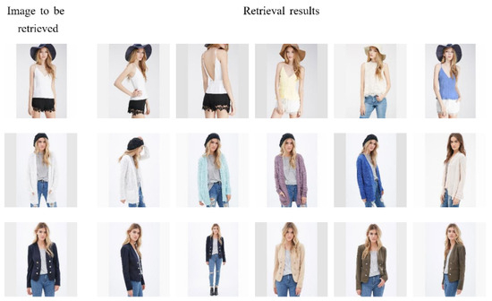 The typical CBIR (content-based image retrieval) system firstly needs to select the appropriate feature extraction methods according to different fields, application scenarios, and systems to analyze and process all the images in the image database, and extract the different forms of image features in various ways. Then, the features are quantified and saved in the database, and finally, an index mechanism is established to facilitate users’ query. In the field of clothing image retrieval, there are many ways to measure the similarity level of two images, one of which is Metric learning [36]. The accuracy of image retrieval has a great relationship with the selected similarity measurement method. In order to make image retrieval more accurate and efficient, it is necessary to select a suitable distance calculation method between images. The measurement function [37] mainly includes the Manhattan distance, Euclidean distance, histogram intersection distance, and cosine similarity. In the stage of image retrieval, different kinds and different forms of features will be extracted from the different kinds of images. In actual operation, it is necessary to select appropriate similarity calculation methods according to the characteristics of different images, so that the required images can be retrieved more accurately and efficiently.