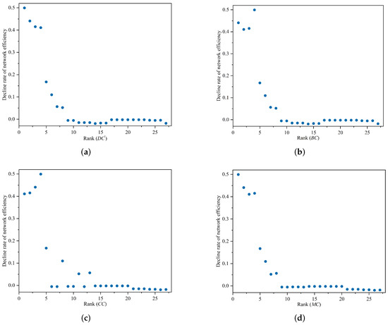 Then, we observe the decline rate of network efficiency by deleting node i as a way to determine whether the node’s importance ranking in the network is justified. Let be the decline rate of network efficiency: