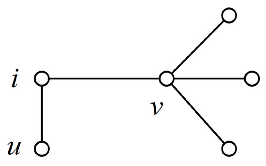Let the transfer probability matrix be . In general, the probability of node i jumping to its neighboring nodes is the same, i.e., . For example, in Figure 3, node i has the same probability of selecting node u and node v as the node for the next jump. But the proposed algorithm changes the transfer rule of node i. We consider that nodes with a larger degree have a higher probability to attract node i, i.e., node i has a higher possibility to transfer to node v in Figure 3 (). is defined as Equation (11).
