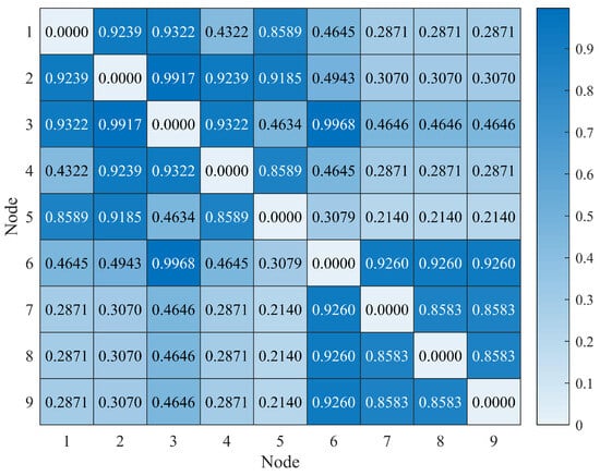 where denotes the number of triangular structures formed by node i and node j. The closeness between node i and node j can be expressed by Equation (16).