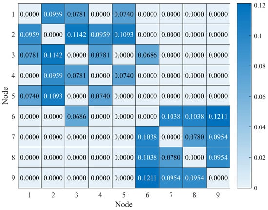 The transfer probability matrix needs to satisfy two conditions: (1) . (2) The sum of the elements in each row is equal to 1, i.e., . Below we prove that the transfer probability matrix P as defined in Equation (11) satisfies the above two conditions.