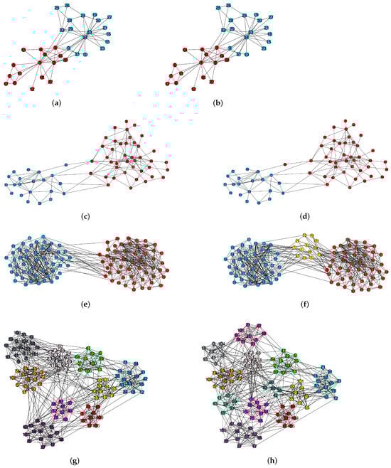 Comparison results obtained by RWBS with the real division result on real-world networks with ground truth. (a) The division result obtained by RWBS (, , ). (b) The real community structure of the Karate network (). (c) The division result obtained by RWBS ( = 0.8889, , ). (d) The real community structure of the Dolphin network (). (e) The division result obtained by RWBS ( = 0.7365, , ). (f) The real community structure of the Political network (). (g) The division result obtained by RWBS ( = 0.8671, , ). (h) The real community structure of the Football network ().