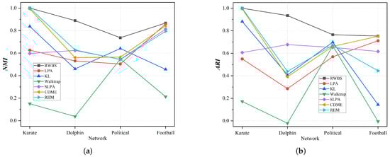 To further show the superiority of RWBS in detecting communities, we selected Walktrap [10], LPA [12], KL [13], SLPA [30], CDME [33], and RIIM [17] as benchmark algorithms. Table 4 and Figure 10 show the results of the comparison between RWBS and these benchmark algorithms in terms of and . From Table 4 and Figure 10, it can be seen that the results on the networks with ground truth obtained by RWBS have maximum values in terms of and . Moreover, the division result obtained by RIIM on the Karate network is consistent with its real community structure. CDME (LPA and CDME) can also achieve satisfactory results on the Karate (Football) network. Walktrap detects poor community structures on these four networks.