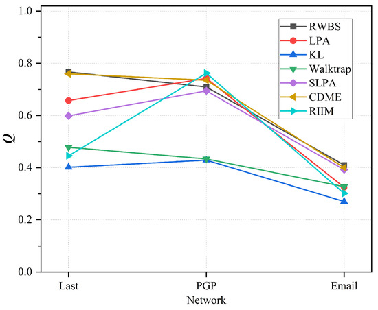 We used Q as the metric to measure the quality of detected communities on networks without ground truth. We let the number of seed nodes be . The comparison results between RWBS and benchmark algorithms in terms of Q are shown in Table 5 and Figure 11. RWBS can obtain the maximum Q values on the Last and Email networks, CDME can also achieve satisfactory Q values on both networks. For the PGP network, RIIM can obtain the maximum Q value. RWBS, LAP, and CDME can also obtain large Q values (they all have Q values more than 0.7).