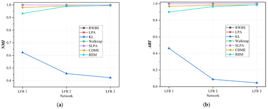 Comparison results between RWBS and benchmark algorithms on synthetic networks in terms of and (the values of LPA, SLPA, and CDME are averages obtained by running 10 experiments independently). (a) NMI. (b) ARI.