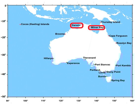 The historical dataset for Darwin and Milner Bay in the Northern Territory of Australia from the “Australian Baseline Sea Level Monitoring Project Hourly Sea Level and Meteorological Data” (http://www.bom.gov.au/oceanography/projects/abslmp/data/index.shtml, accessed on 15 July 2023) provided by the Bureau of Meteorology (BOM), Australia, was used for this study. This dataset includes hourly tide gauge data for the study locations from 1990 to 2022. Tide gauge observations provide continuous data that are useful for modelling future sea level predictions []. The dataset includes oceanic data such as sea level height (in m), water temperature (in °C), air temperature (in °C), barometric pressure (in hPa), wind direction (in degrees True), wind gust (in m/s), and wind speed (in m/s) at 60 min intervals. With the goal of tracking sea levels along Australia’s coastline, BOM developed the Australian Baseline Sea Level Monitoring Project. The tide gauge is a part of a water observation station that gathers data using installed sensors. The study locations are Darwin and Milner Bay with latitudes and longitudes of 12°27′40′′ S, 130°50′30′′ E and 12°23′11′′ S, 130°51′43′′ E, respectively, in the state of Northern Territory, Australia. The research area map of the two coastal cities is displayed in Figure 1 below.
