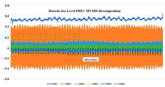 Decomposed sea level IMFs obtained from MVMD decomposition for the Darwin study site. The IMFs represent the local characteristics of the sea level signal and represent intrinsic modes of oscillation that reflect the sea level signal variability.