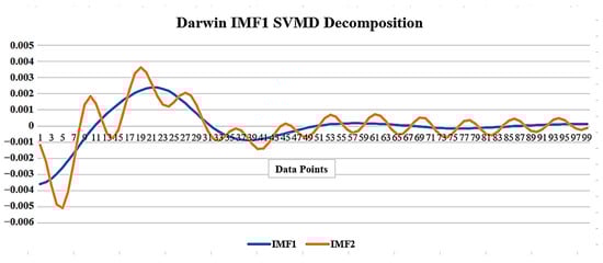 Each IMF was further decomposed by Successive Variational Mode Decomposition (SVMD), which was first presented in []. This allows for the sequential extraction of modes for more feature information from the MVMD decomposed IMFs. Thus, SVMD offers less computing overhead and is based on the same concepts as Variational Mode Decomposition (VMD). The input signal is subjected to consecutive applications of Variational Model Extraction (VME), which adds restrictions to stop convergence on formerly obtained modes. In the process to extract the intrinsic modes in the decomposition algorithm, the convergence on previous extracted modes is restricted to ensure that the algorithm continues to extract new modes until all relevant modes are identified []. To locate the signal containing the most compact spectrum, the optimization problem is handled while guaranteeing the reconstruction error is minimized via the Lth mode extracted sum. With 100 data points, the intrinsic mode decomposition (IMF) of the sea level (lag) in Darwin is shown in Figure 4 below. It should be noted that IMFs are derived from the original sea level signal via the decomposition process which focusses on the properties of the signal such as the zero mean, the number of extrema, and symmetric envelopes; hence, they are unitless [].