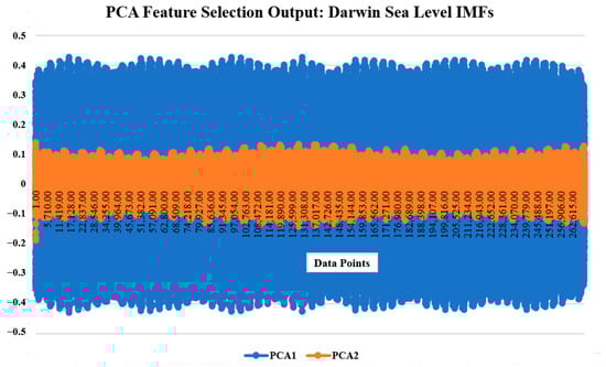 Figure 6 shows the PCA reduction in Darwin sea level IMFs. PCA identifies patterns and correlation in the sea level IMFs and compresses the data but preserves the important information for further analysis [].