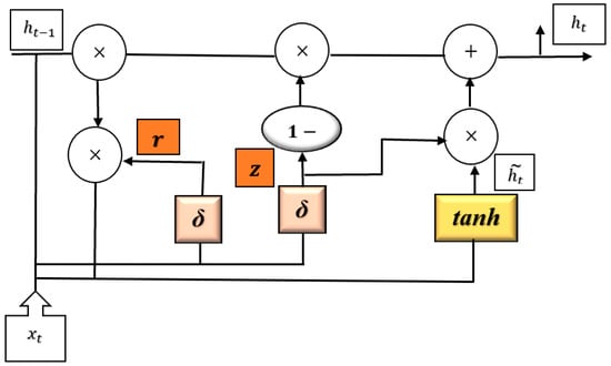 CNN is a feedforward and backward neural network that can be considered to work in two parts: a feature extraction and a classification part []. CNN is different from a traditional neural network by the inclusion of multiple layers, pooling, local connections, and sharing of weights [,]. BiGRU is a deep learning architecture with two Gated Recurrent Units (GRUs). Thus, the CNN-BiGRU model can successfully capture temporal dependencies in the data and uses these two gating mechanisms to selectively update the hidden state of the network on each step, making it an effective tool for forecasting [,]. The GRU shown in Figure 7 includes a reset and update gate which have the following equations: