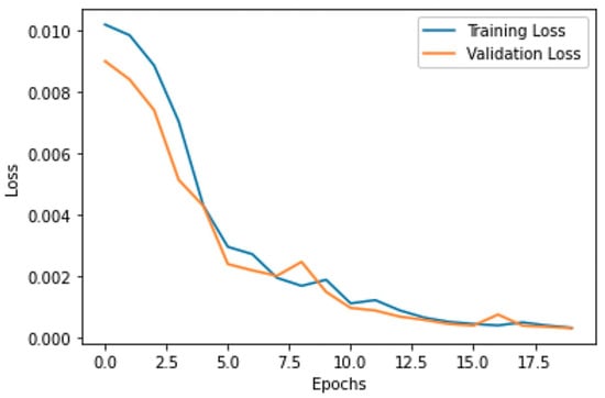 This study used BiGRU, which takes input in both forward and backward processes. This helps to increase its efficiency for capturing important information from the input dataset []. Figure 8 below shows the Python modelling using the CNN-BiGRU model after the MVMD-SVMD IMF feature extraction. Figure 9 shows the associated validation and training loss during the process.
