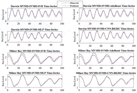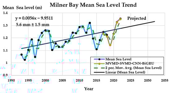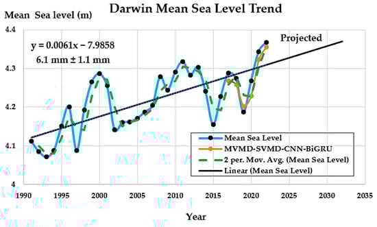 Sea level rise (SLR) attributed to the melting of ice caps and thermal expansion of seawater is of great global significance to vast populations of people residing along the world’s coastlines. The extent of SLR’s impact on physical coastal areas is determined by multiple factors such as geographical location, coastal structure, wetland vegetation and related oceanic changes. For coastal communities at risk of inundation and coastal erosion due to SLR, the modelling and projection of future sea levels can provide the information necessary to prepare and adapt to gradual sea level rise over several years. In the following study, a new model for predicting future sea levels is presented, which focusses on two tide gauge locations (Darwin and Milner Bay) in the Northern Territory (NT), Australia. Historical data from the Australian Bureau of Meteorology (BOM) from 1990 to 2022 are used for data training and prediction using artificial intelligence models and computation of mean sea level (MSL) linear projection. The study employs a new double data decomposition approach using Multivariate Variational Mode Decomposition (MVMD) and Successive Variational Mode Decomposition (SVMD) with dimensionality reduction techniques of Principal Component Analysis (PCA) for data modelling using four artificial intelligence models (Support Vector Regression (SVR), Adaptive Boosting Regressor (AdaBoost), Multilayer Perceptron (MLP), and Convolutional Neural Network–Bidirectional Gated Recurrent Unit (CNN-BiGRU). It proposes a deep learning hybrid CNN-BiGRU model for sea level prediction, which is benchmarked by SVR, AdaBoost, and MLP. MVMD-SVMD-CNN-BiGRU hybrid models achieved the highest performance values of 0.9979 (d), 0.996 (NS), 0.9409 (L); and 0.998 (d), 0.9959 (NS), 0.9413 (L) for Milner Bay and Darwin, respectively. It also attained the lowest error values of 0.1016 (RMSE), 0.0782 (MABE), 2.3699 (RRMSE), and 2.4123 (MAPE) for Darwin and 0.0248 (RMSE), 0.0189 (MABE), 1.9901 (RRMSE), and 1.7486 (MAPE) for Milner Bay. The mean sea level (MSL) trend analysis showed a rise of 6.1 ± 1.1 mm and 5.6 ± 1.5 mm for Darwin and Milner Bay, respectively, from 1990 to 2022.