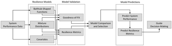 To address this gap in past research, this paper explores three alternative methods to characterize system performance and predict various resilience metrics using techniques from reliability engineering. Figure 1 presents the research steps. First, datasets on system performance are collected. Second, resilience models based on (i) bathtub-shaped hazard functions [42], (ii) mixture distributions, and (iii) regression models that incorporate covariates to characterize deterioration and recovery are built. Third, to validate the performance of each model on the datasets considered, we calculate goodness-of-fit measures and interval-based resilience metrics. Fourth, these results are then compared to select the best-performing model. Lastly, the selected model is used to predict system performance and consequently resilience metrics, which subsequently guide decision-making for enhancing system resilience. For illustration, we evaluate these alternative approaches using widely accessible historical data on seven U.S. recessions to predict changes in the nonfarm payroll employment index during economic crises. Our findings suggest that the bathtub-shaped hazard function and mixture distributions perform effectively on data sets displaying V, U, L, and J-shaped curves. However, these models fail to characterize the W and K-shaped curves that often appear in various domains, particularly in economic systems, which deviate from the assumption of a single decline followed by a recovery. This limitation arises because the models do not explicitly account for the underlying factors driving degradation and recovery. In contrast, models incorporating explanatory covariates can capture curves of any shape, including those with multiple shocks, sharp drops, and slow recovery, which the other models struggle to fit. These covariate models offer a superior goodness-of-fit and predictive accuracy for resilience metrics, providing a versatile framework for data collection and predictive modeling across various resilience curves.
