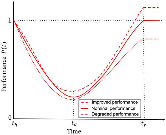 To illustrate the concept of changes in performance, Figure 2 shows notional resilience curves possessing a bathtub shape. The original performance at time , when a disruption is encountered, is represented by the horizontal line. Performance declines until it reaches a degraded performance at time . If the degradation is instantaneous, then . In some cases, the system is not resilient, resulting in the performance dropping to . Conversely, if it is resilient, system performance increases from until a high-level performance is achieved at time . Figure 2 shows three scenarios: (i) when system performance is degraded (dotted), (ii) when system performance is nominal (solid), and (iii) when system performance is enhanced (dashed). Some systems, such as power generation, may recover only to the maximum nominal performance, while economic and automatic systems involving artificial intelligence and machine learning can achieve an improved performance.