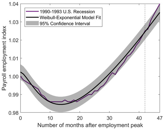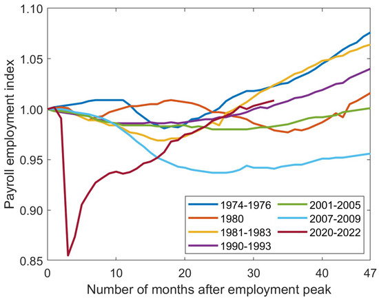 This section illustrates the three proposed modeling approaches to characterize system performance and assess resilience using different examples. Seven U.S. recession datasets documented by the Bureau of Labor Statistics Current Employment Statistics Program [57,58] are shown in Figure 3, including the most recent recession caused by the COVID-19 pandemic. In each example, we evaluate each model’s performance on these data sets by computing goodness-of-fit measures and resilience metrics. Nonetheless, these modeling efforts aim to enhance the overall theory of predictive resilience engineering across multiple domains.