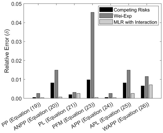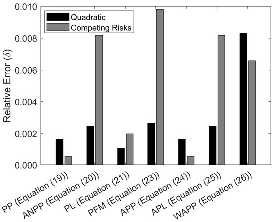 Figure 6 shows that the quadratic model better predicted four out of seven metrics, but the relative error was lower than across all metrics for both models, with the exception of the average normalized performance lost (ANPL, Equation (22)), because the system improved its performance to a higher level than the initial performance. As a result, a negative performance loss is experienced in the predictive period, and the respective relative errors for the ANPL of the quadratic and competing risk models are and . Since these values are substantially larger than the errors in the other metrics, they are not shown in Figure 6 to enable an easier comparison of the other seven metrics.
