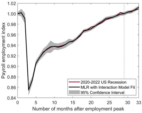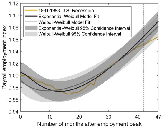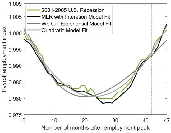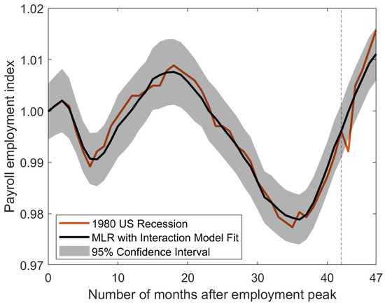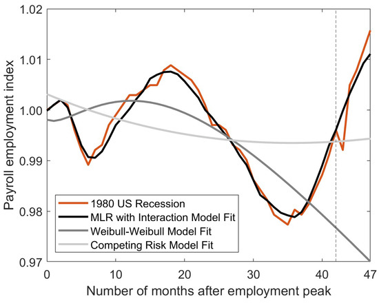 to illustrate an increasing trend characteristic of the economic data. The remaining of the data not used for model fitting were then predicted using the models, and the RMSE (Equation (13)), PRMSE (Equation (14)), (Equation (15)), and EC were calculated, as presented in Table 4 for , which worked well for all the recessions considered in Figure 3.