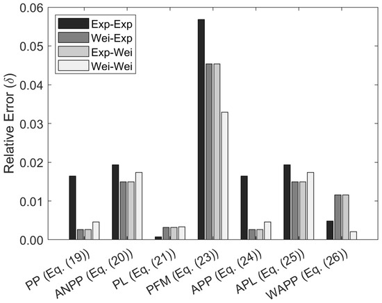In addition to validating the ability of the bathtub-shaped function to fit the resilience curves using statistical methods, the interval-based metrics described in Section 5 are also predicted. These metrics include the performance preserved (PP, Equation (19)), normalized performance preserved (ANPP, Equation (20)), performance lost (PL, Equation (21)), normalized performance lost (ANPL, Equation (22)), performance preserved from the minimum (PFM, Equation (23)), average performance preserved (APP, Equation (24)), average performance lost (APL, Equation (25)), and weighted average performance preserved before/after the minimum (WAPP, Equation (26)). Figure 6 shows the relative error of the quadratic and competing risk resilience metrics computed using the 1990–1993 dataset, assuming , which assigns equal weight to the average performance preserved before and after the minimum. For example, the relative error for performance preserved is calculated as follows: