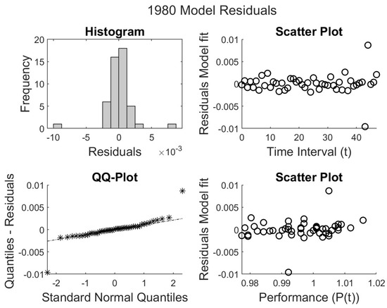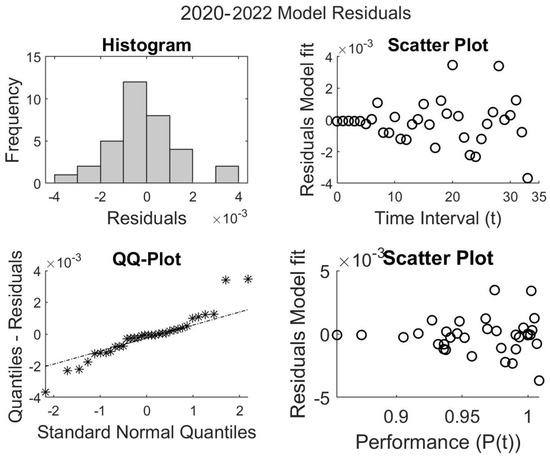 where and are the current and past performance, respectively, and represents changes in performance. Alternative regression methods [52] incorporating covariates that influence the deterioration and recovery phases are used to model . These methods include (i) multiple linear regression, (ii) multiple linear regression with interactions, and (iii) polynomial regression, assuming normally distributed residuals. The normality assumption guarantees that the model findings are reliable and can be generalized from the sample data to an overall population with confidence. The normality assumption of the residuals can be verified in three ways: (i) the histogram is roughly bell-shaped, (ii) the quantile–quantile plot (QQ plot) falls along a roughly straight line at a 45-degree angle, and (iii) the scatter plots of the residuals are independent, linear, and exhibit a constant variance over time. In cases where the normality assumption is violated, strategies to address violations can be applied such as data transformation to stabilize and normalize the variability of the residuals, or analysis without outliers to assess their influence in the model, if any are detected.