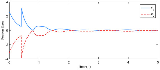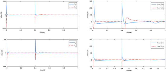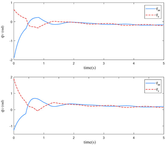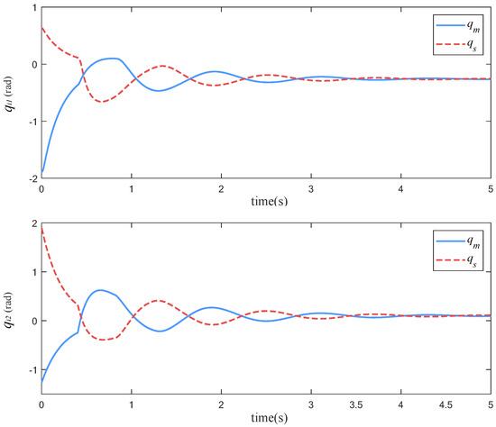 The position and velocity of the manipulators are denoted as and . The initial conditions are . The external disturbance and time delay are chosen as s, respectively.