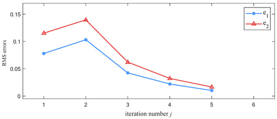 The simulation results with the proposed controller under alignment condition are depicted in Figure 4, Figure 5, Figure 6, Figure 7 and Figure 8. Figure 4 shows that the trajectory profiles of the remote robot at the first iteration have large deviations from the local robot. Contrary to Figure 4, the trajectory profiles of manipulator robot at the fifth iteration, illustrated in Figure 5, show that the remote robot’s trajectory is distinguished with the developed controllers. At the fifth iteration, the position errors all decrease sharply, as shown in Figure 6. We define the root mean square (RMS) errors at the jth iteration as , where N is the number of data points. As shown in Figure 7, the RMS errors are reduced as the learning process evolves along the iteration domain. The control inputs and saturated inputs at the first iteration are portrayed in Figure 8, which shows that the latter are constrained with [−100N, 300N]. Consequently, the above simulation results confirm the validity of Theorem 1.