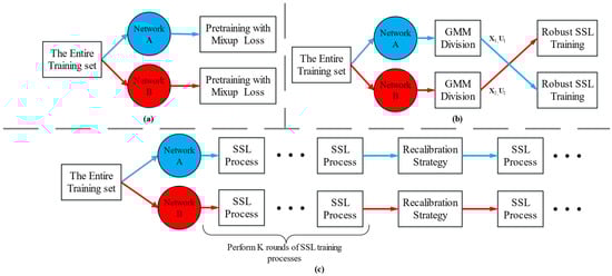 The overall framework of the SMR. (a) Pre-training process with mixup loss. We pre-train two networks, A and B, that had the same structure for several epochs using mixup loss. (b) Pure SSL robust training process. During each SSL training process, the entire dataset is first fed into networks A and B for data partitioning. At this stage, the labeled subset and the unlabeled subset , divided based on network A using the GMM, are used for the robust SSL training of network B, and vice versa. (c) SSL training process with the recalibration strategy. After per K rounds of pure SSL training processes, we use the proposed recalibration strategy based on CE loss to correct the optimization direction of networks A and B. This enhances the robustness and performance of the model.