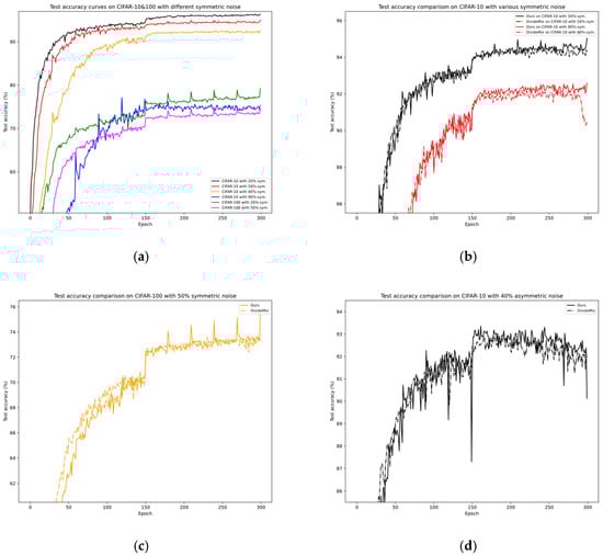 In Figure 2a, we present the variation in the test accuracy of the proposed method across various symmetric noise scenarios. In Figure 2b,c, we visually compare the performance difference between our method and DivideMix in different symmetric scenarios using the test accuracy curves. It is evident from the figures that our method consistently maintains robustness as the iterations progress, whereas DivideMix exhibits some degree of overfitting. Next, to assess the potential application of our method in medical image processing (e.g., medical image segmentation and classification tasks with noisy labels), we refer to [40,41,42,43] and present other metrics, such as precision, recall, the F1-score, and the confusion matrix, for our method on the CIFAR dataset with symmetric noise to further demonstrate its robustness. Due to the large number of categories in CIFAR-100, displaying its confusion matrix is quite challenging. Therefore, we only provide the confusion matrix for CIFAR-10. The results for precision, recall, and the F1-score are shown in Table 2, while the confusion matrixes for CIFAR-10 are presented in Figure 3a–d.
