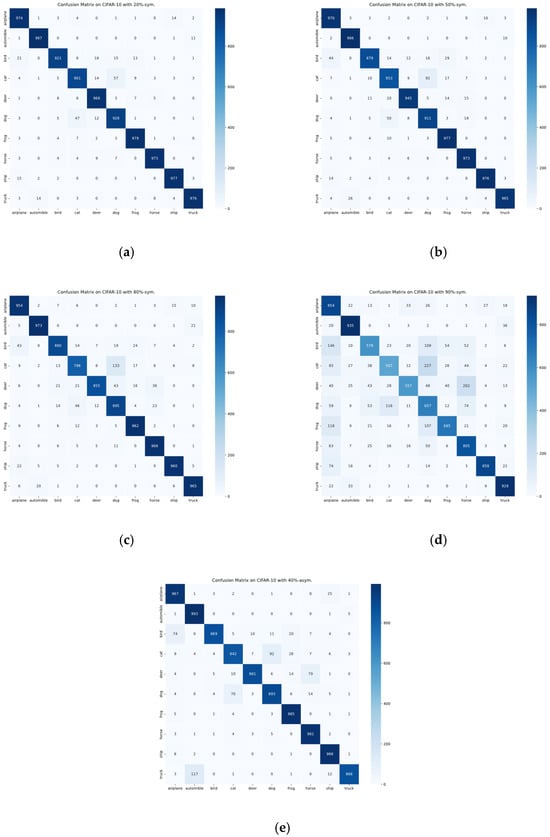Confusion matrix for our method on CIFAR-10. (a) Confusion matrix on CIFAR-10 with 20% symmetric noise. (b) Confusion matrix on CIFAR-10 with 50% symmetric noise. (c) Confusion matrix on CIFAR-10 with 80% symmetric noise. (d) Confusion matrix on CIFAR-10 with 90% symmetric noise. (e) Confusion matrix on CIFAR-10 with 40% asymmetric noise.