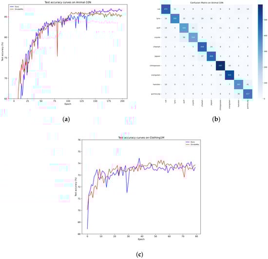 Animal-10N: This is a real-world noisy dataset that contains 50,000 images for training and 10,000 images for testing [36]. The original pixel size is 64 64 and is not resized. The data transformation strategies are the same as those used for CIFAR-10. Following previous research, we use Vgg-19N as the backbone model and the SGD optimizer with a momentum of 0.9 and a weight decay of 1 × 10−3. The batch size is set to 128. Additionally, the learning rate is set to 0.01 and decayed by a factor of 10 and 100 after 80 and 140 epochs, respectively. The values of and are set to 30 and 200, respectively. The coefficient is set to 0, K = 15, and . The detailed parameter settings are presented in Table 1.