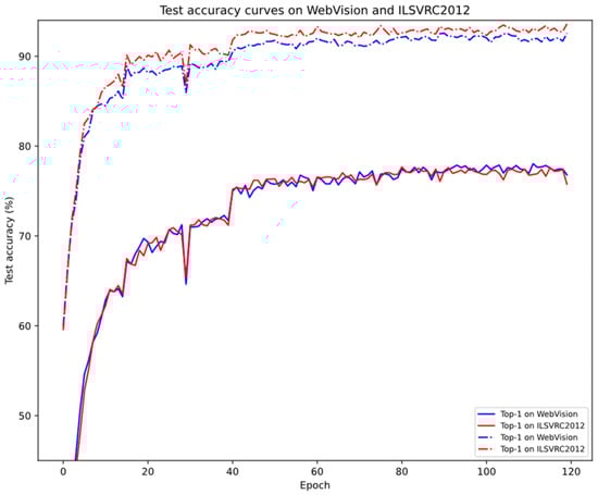 WebVision: It is a real-world noisy dataset that contains more than 2 million images with noisy labels for training and 50,000 images for testing [39]. When validating the effectiveness of the proposed method in this dataset, previous research selected samples from the first 50 categories for the experiment and reported the accuracies of the testing set from both WebVision and ILSVRC2012. This setting is followed, and the other parameter settings are shown in Table 1. The original size is 320 320 pixels, which is resized to 299 299. Following DivideMix, we use Inception-ResNet-V2 as the backbone. All the experimental settings are the same as Clothing1M, except for the learning rate, which is set to 0.01 and decayed by a factor of 10 and 100 after 40 and 80 epochs, respectively. The values of and are set to 1 and 120, respectively. The recalibration interval K is set to 15.