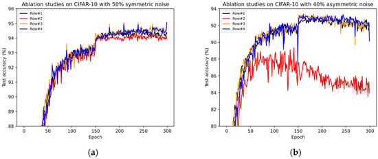 Furthermore, in Figure 6a,b, we visually compare the performance difference among four sets of ablation experiments across different noise scenarios through the test accuracy curves. It is evident from the figures that rows #3 and #4 (with the CE-loss-based recalibration process (RP)) consistently achieve better performance as the iterations progress when compared with rows #1 and #2 (without RP). This demonstrates the effectiveness of the recalibration strategy introduced in this paper.