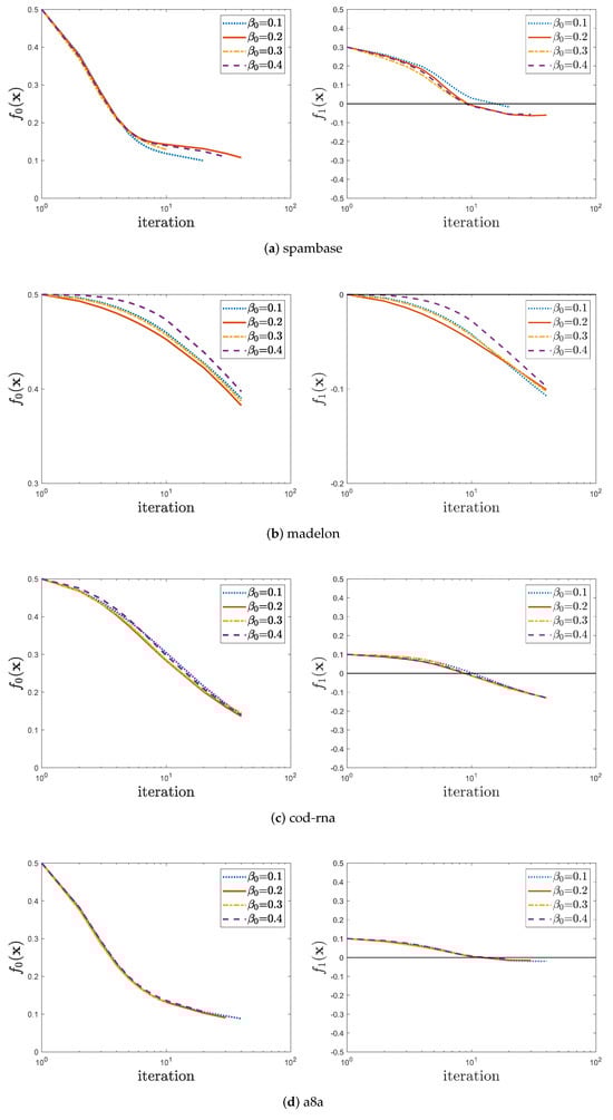 In the experiments, we set for spambase, for madelon, and for cod-rna and a8a. Let error tolerance . Set , at the k-th outer iteration. In the SPDAM subroutine, we set , and the acceleration parameter pair . Let the mini-batch size of a8a be 20 and set the mini-batch size of spambase, madelon, and cod-rna to 10. In addition, for each dataset, the initial point is set to the zero vector. In particular, we set the number of iterations of the subroutine to , which is significantly smaller than the condition specified in (32).