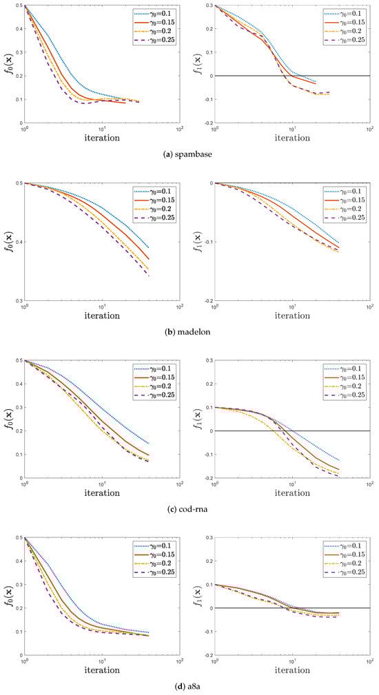 In this section, we present the numerical performance of Algorithm 1 (with Algorithm 2 as a subroutine) in solving convex and non-convex NPC problems [,]. For a more intuitive illustration, we present two types of comparison experiments, shown in Section 4.1 and Section 4.2. In Section 4.1, we first compare the performance of our proposed method for solving non-convex NPC problems, under different initial step size choices. Next, in Section 4.2, we compare the SPDAM with APriD [], MSA [], CSA1, and CSA2 [] on solving the convex NPC problems.