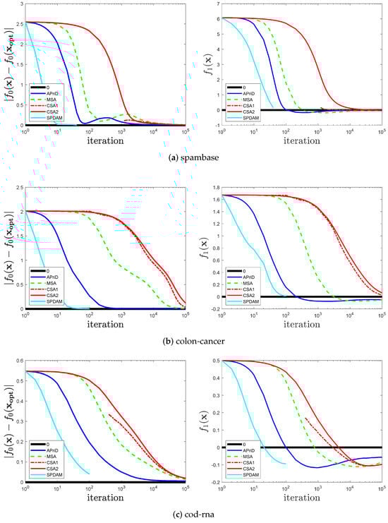 In the experiments, we set for spambase, for colon-cancer, and for cod-rna. And the tolerance is again set to . At the k-th outer iteration, we set . In the SPDAM subroutine, we set , the acceleration parameter pair , and the number of iterations . Let the mini-batch size be 5 for the colon-cancer dataset and 10 for the spambase and cod-rna datasets. Additionally, the initial point is set to a vector with all elements as −4.