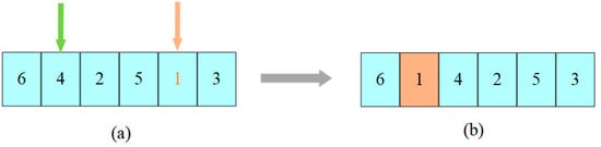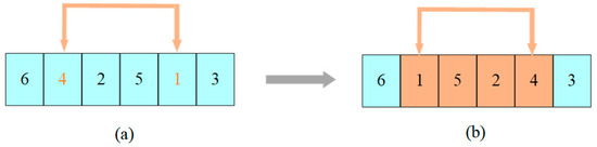 Crossover, often referred to as recombination, plays a vital role in evolutionary algorithms by combining the genetic information from two parents to produce offspring with hopefully better chromosomes. Essentially, crossover replaces partial structures of two-parent bodies to generate novel individuals. This operation not only retains the characteristics of high-quality individuals from the parent chromosomes but also maintains the diversity of solutions [33]. In this paper, before performing any operation on chromosome , node 0 (this node representing depot) is removed and contained within it first. The crossover operation is shown in Figure 4, where fragments (4,2,5) are selected from the parent , fragments (1,3,4) are selected from the parent , and then fragments (4,2,5) and (1,3,4) are placed before the parent and , respectively. The duplicate nodes are deleted, generating two new parents and . Finally, the depot insertion operator is used to repair infeasibility in the offspring generated by the crossover operator.