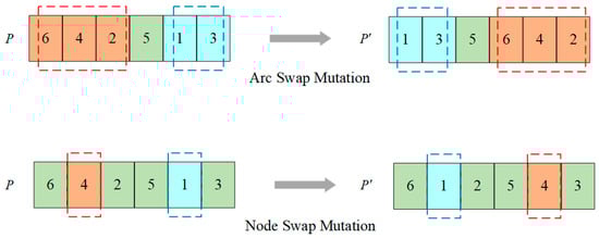 The mutation operator mainly imitates the gene mutation phenomenon in the process of biological evolution in nature and changes the individual gene values on the chromosome to obtain new chromosomes [34]. An excellent mutation operator can effectively avoid converging to the local optimum and generate high-quality solutions. The PTS algorithm proposed by this research selects the node swap mutation operator and the arc swap mutation operator to achieve diversity and widen the search space span.