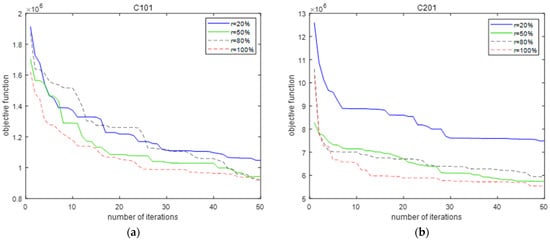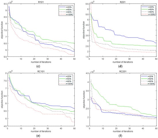 Finally, the portion of the population to be filled was determined, and a set of runs with different percentages () for the six instances C101, C201, R101, R201, RC101, and RC201 was performed. Here, represents the population percentage filled by the current optimal solution of the TS algorithm in the PTS algorithm, while the remaining portion () is filled randomly to achieve diversity. Figure 7 shows the iteration diagrams of six instances at four different proportions (20%, 50%, 80%, and 100%). Figure 7 shows that using the current optimal solution generated by each iteration of the TS algorithm as a chromosome to fill the entire population () can make the PTS algorithm converge to a better solution.