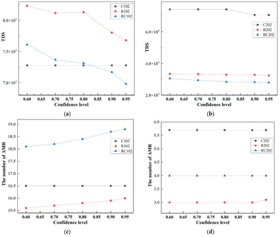 The impact of changing confidence levels: (a) the impact of confidence levels of types C1, R1, and RC1 instances on TDS; (b) the impact of confidence levels of types C2, R2, and RC2 instances on TDS; (c) the impact of confidence levels of types C1, R1, and RC1 instances on the number of AMR; (d) the impact of confidence levels of types C2, R2, and RC2 instances on the number of AMR.
