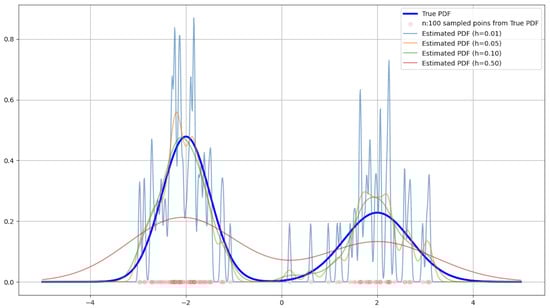 The importance of this (hyper)parameter relies on the fact that it is responsible for the delicate balance between overfitting and underfitting the data. Underestimated bandwidth (small h) leads to small bias and large variances, with the increased complexity of the resulting PDF that overfits the training set. Overestimated bandwidth (large h) leads to an increase in bias and small variances (e.g., underfitting). Hence, achieving this balance is crucial for a successful application of the KDE method [37]. Although the problem of the automatic selection of the kernel’s bandwidth estimation has been explored by many authors, no procedure has yet been considered the best in every situation [27].