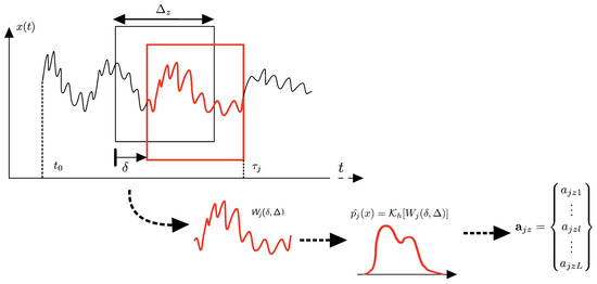 Entropic techniques for feature extraction first require time localization criteria, when applied to time series. Subsequently, an inference solution is needed to transform the data into a probability function. This approach can be referred to as Time-Dependent Entropy (TDE) [11]. Therefore, the parameters governing this transformation can be divided into two groups, the time-localization and the inference parameters, the latter specific for each inference solution utilized. Those two sets of parameters are related. Combining the window localization with the inference solution, the result is an ordered set of windowed probability distributions. To accomplish this goal, various inference solutions have been tested, such as symbolic solutions [12,19], non-parametric discrete inference or histogram [7,8,11,20], power spectral density [21], approximate entropy [22], wavelet entropy [5,22], sample and fuzzy entropy [23,24,25], Kraskov entropy [26], and neural network entropy [14]. Among them, few efforts have been applied to testing continuous non-parametric inference solutions, such as kernel density estimation (also called Parzen–Rosenblatt window) [13]. Moreover, for detecting anomalies, the utilization of different window scales for time localization is crucial for the sensitivity of the transformation [20], yet almost all the cited works only employ one window size.