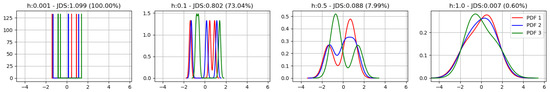 Then, it is analysed how changes when acting on one variable while keeping the other two constants. Starting with h, the score decreases monotonically as the bandwidth increases. This occurs because a wider kernel reduces the distance between the inferred PDFs. An illustrative example of this phenomenon can be observed in Figure 4. Specifically, as h approaches 0, the KDE tends to coincide with the empirical distribution, allowing for the computation of the exact maximum JSD score based on the relative frequency distribution. Conversely, as h approaches , the differences between the distributions are annealed, resulting in . Further information is available in Appendix A.