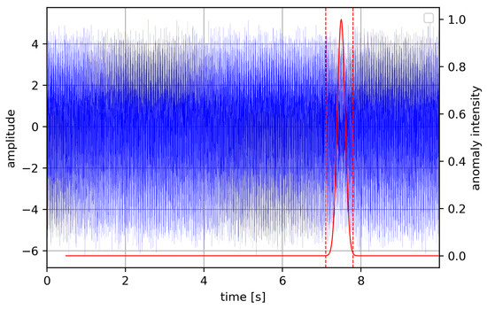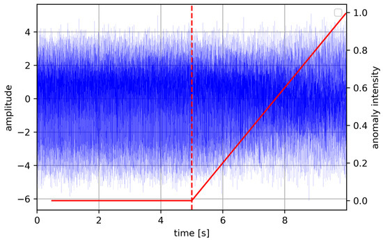 which consists of a normal state signal, comprising tones, and an anomaly signal composed of tones. Each tone is characterized by an amplitude, , a characteristic frequency, , and a phase, . The design of Equation (20) allows the simulation of various types of anomalies. For instance, we can simply generate an anomaly signal by adding new tones, modifying the amplitude of the normal ones, or a combination of both. The transition between the two signals is controlled by a modulation function, , adding flexibility to the experiment. In particular, can be a function gradually transitioning from the normal state to an anomalous one, or a localized function to pinpoint the anomaly at a specific time spam. The last term in Equation (20), , represents white noise applied to the signal.