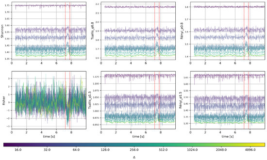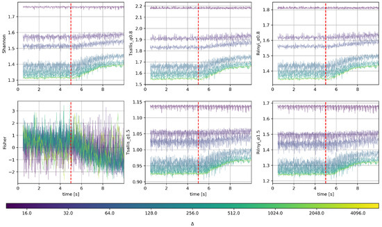 Observing the time-dependent plots in Figure 13, it can be seen how the largest windows recorded a decrease in entropy and an increase in information, right before and after the epileptic attack.