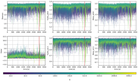 In this context, we consider z window scales, i.e., . At each instance, , Z PDFs are generated. Over each PDF, a predetermined set of information/entropic measures is computed. Since determining the optimal information entropic measures in advance is challenging, and each one analyzes a different aspect of the time signal, employing a combination of such measures improves anomaly detection capabilities. Consequently, we obtain an ordered sequence of matrices , where . Each comprises L distinct entropic or information outputs. The simultaneous use of various measures reveals unique characteristics of the underlying time signal dynamic [5,13].